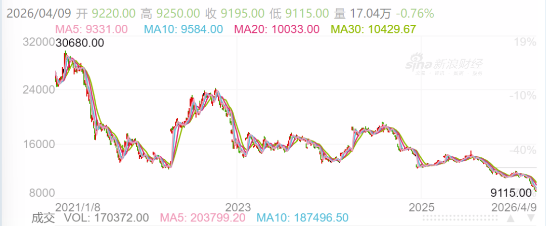 而在期货市场,截至4月9日13时30分,大连商品交易所的生猪期货报价为9165元/吨(折合4.5825元/斤),日环比跌1.35%。广州日报全媒体记者发现,这是生猪期货报价5年来最低的水平。2021年1月8日,生猪期货一度涨至30680元/吨的5年来高位,如今9165元/吨的价格已经不足30680元/吨的3成。