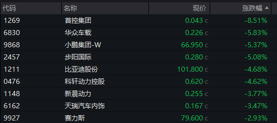 新能源汽车股下挫,小鹏集团跌超5%,比亚迪股份跌超4%,小米集团跌超4%,赛力斯跌近3%。