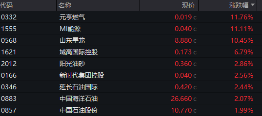 石油石化板块逆市上涨,山东墨龙涨超10%,中国海洋石油、中国石油股份等跟涨。
