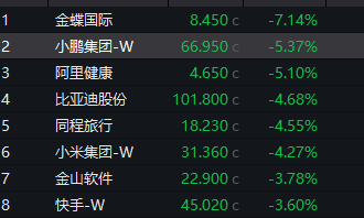 科网股全线回调,金蝶国际跌逾7%,阿里健康跌超5%,金山软件、快手均跌超3%。