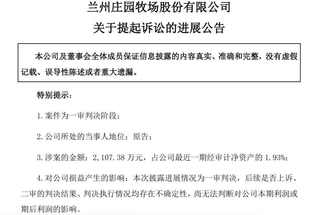 庄园牧场表示,本次披露进展情况为一审判决,后续是否上诉、二审的判决结果、判决执行情况均存在不确定性,尚无法判断对公司本期利润或期后利润的影响。