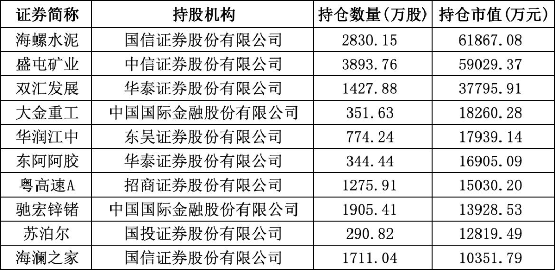 此外,华虹公司、广合科技、上海莱士、邮储银行、海螺水泥、盛屯矿业、神火股份也是券商的重仓股,券商持仓市值均超过5亿元。