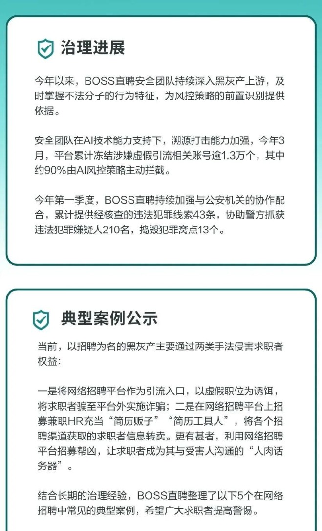 在强化技术治理的同时,平台积极配合警方打击线下黑灰产团伙。今年第一季度,BOSS直聘持续加强与公安机关的协作配合,累计提供经核查的违法犯罪线索43条,协助警方抓获违法犯罪嫌疑人210名,捣毁犯罪团伙13个。
