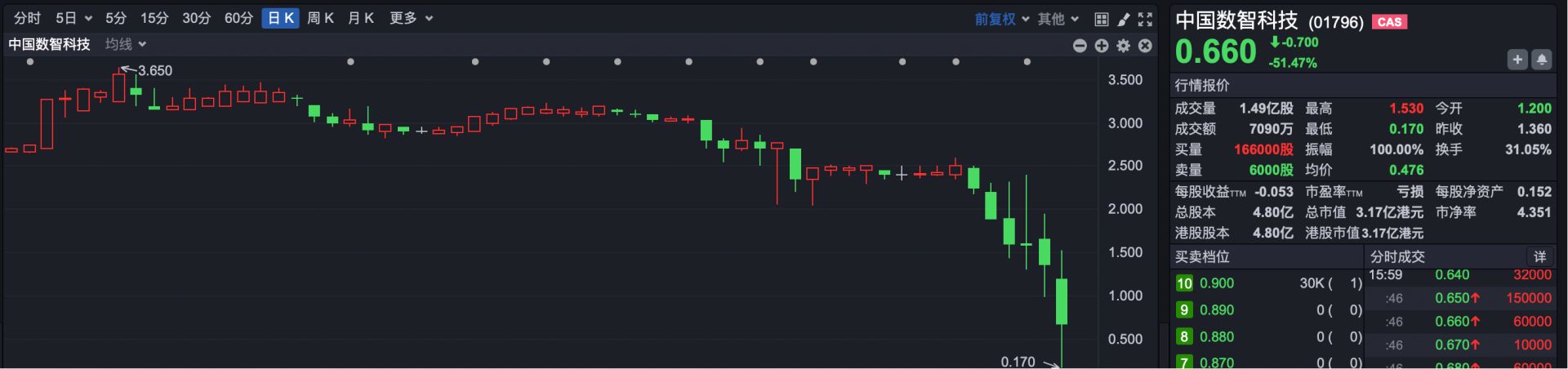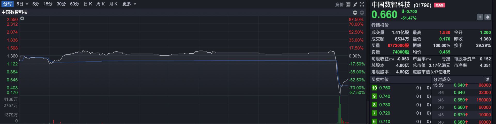 市场焦点方面,中国数智科技(HK01796)尾盘突然闪崩。今日15时45分之前,该股股价一度上涨超10%,最高股价报1.53港元。但随后快速跳水,15时52分时,股价大跌87.5%,最低报0.17港元。尽管收盘时股价略有回升,但依旧大跌51%,以0.66港元报收。