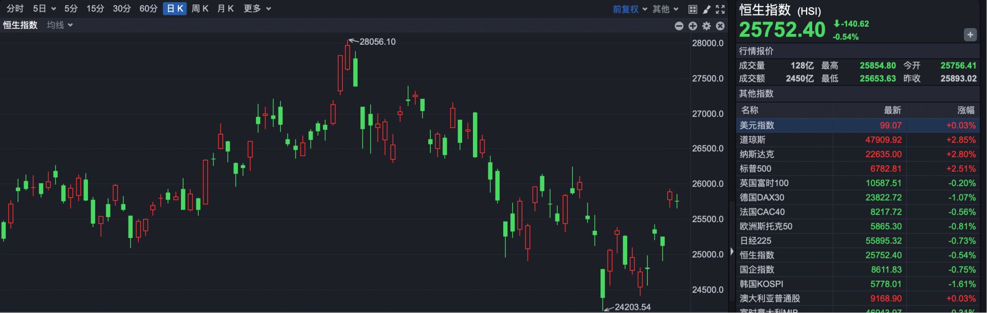 截至收盘,恒生指数报25752.40点,下跌140.62点,跌幅0.54%。