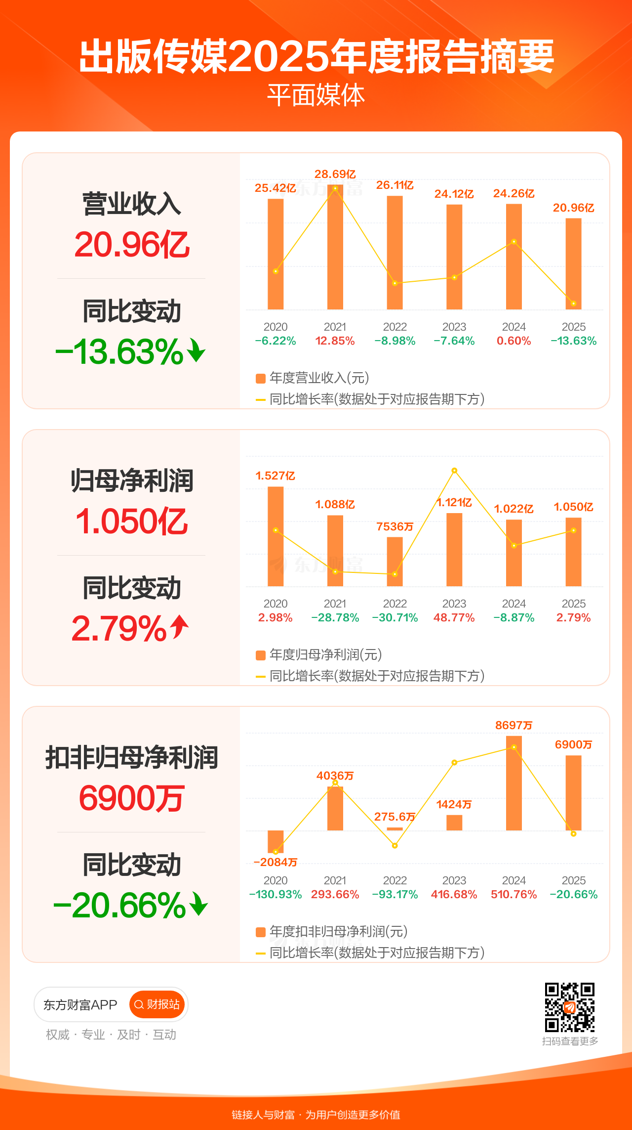 出版传媒4月10日发布2025年年报显示,公司全年实现营业收入20.96亿元,同比下滑13.63%;归母净利润1.05亿元,同比增长2.79%;扣非归母净利润6900.09万元,同比下滑20.66%。