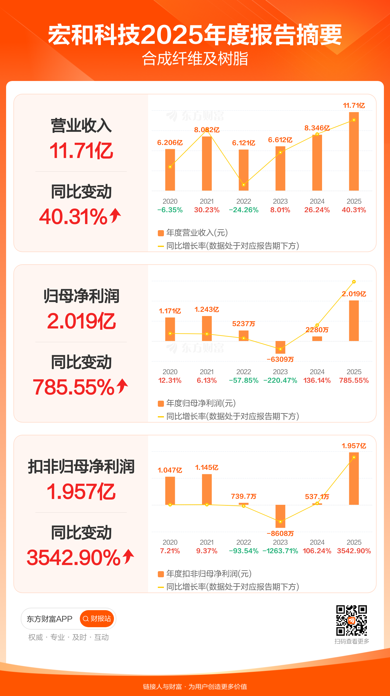 宏和科技4月10日发布2025年年报显示,公司全年实现营业收入11.71亿元,同比增长40.31%;归母净利润2.02亿元,同比增长785.55%;扣非归母净利润1.96亿元,同比增长3542.90%。