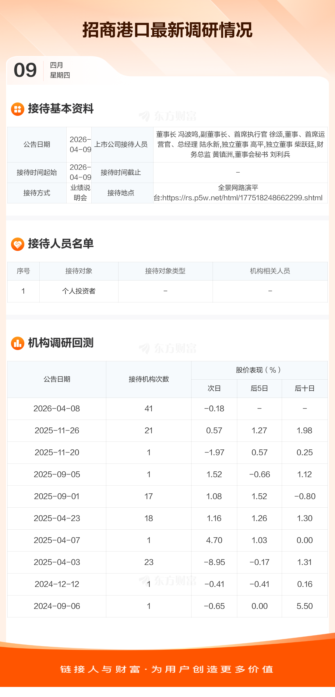 招商港口4月9日公告称,4月9日接待个人投资者等1家机构调研。接待人员包括董事长 冯波鸣,副董事长、首席执行官 徐颂,董事、首席运营官、总经理 陆永新,独立董事 高平,独立董事 柴跃廷,财务总监 黄镇洲,董事会秘书 刘利兵。