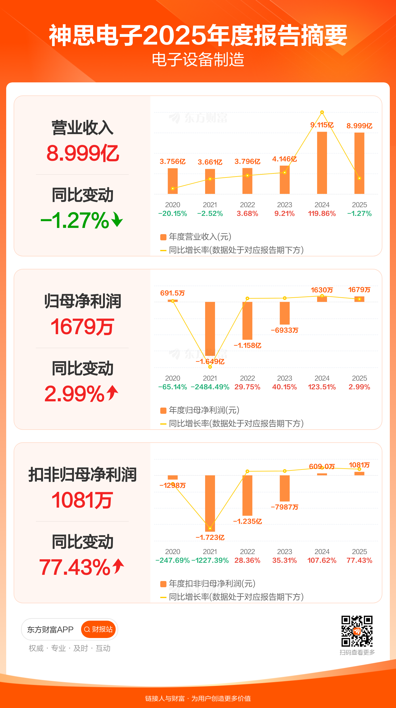 神思电子4月10日发布2025年年报显示,公司全年实现营业收入9.00亿元,同比下滑1.27%;归母净利润1678.84万元,同比增长2.99%;扣非归母净利润1080.51万元,同比增长77.43%。