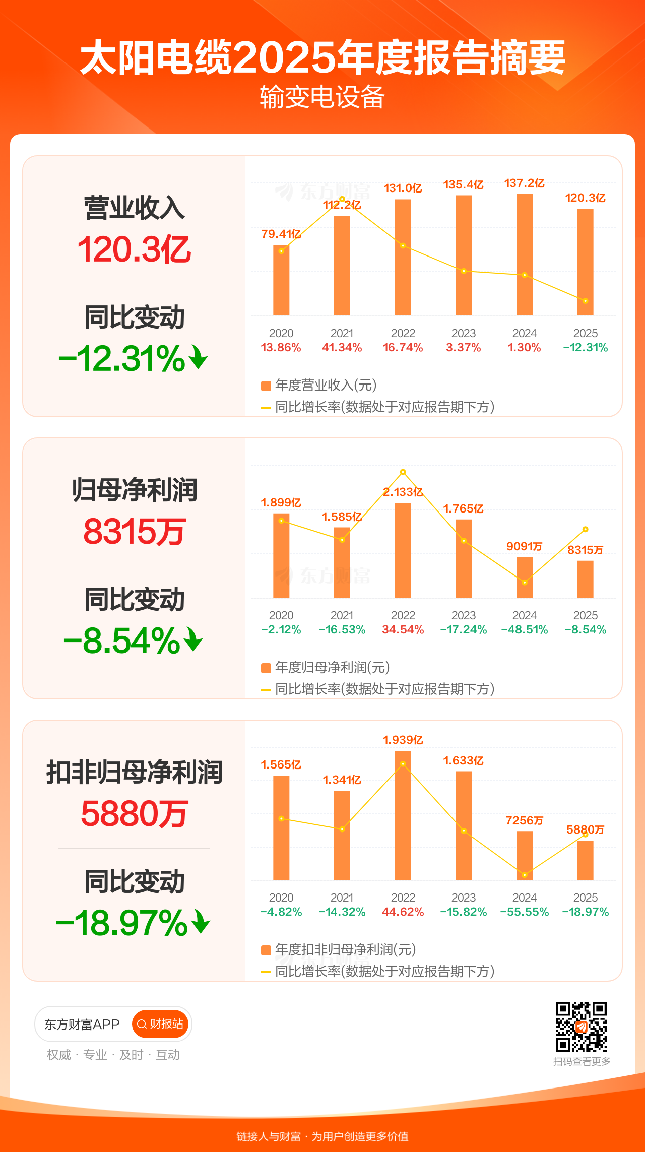 太阳电缆4月10日发布2025年年报显示,公司全年实现营业收入120.31亿元,同比下滑12.31%;归母净利润8314.53万元,同比下滑8.54%;扣非归母净利润5880.18万元,同比下滑18.97%。