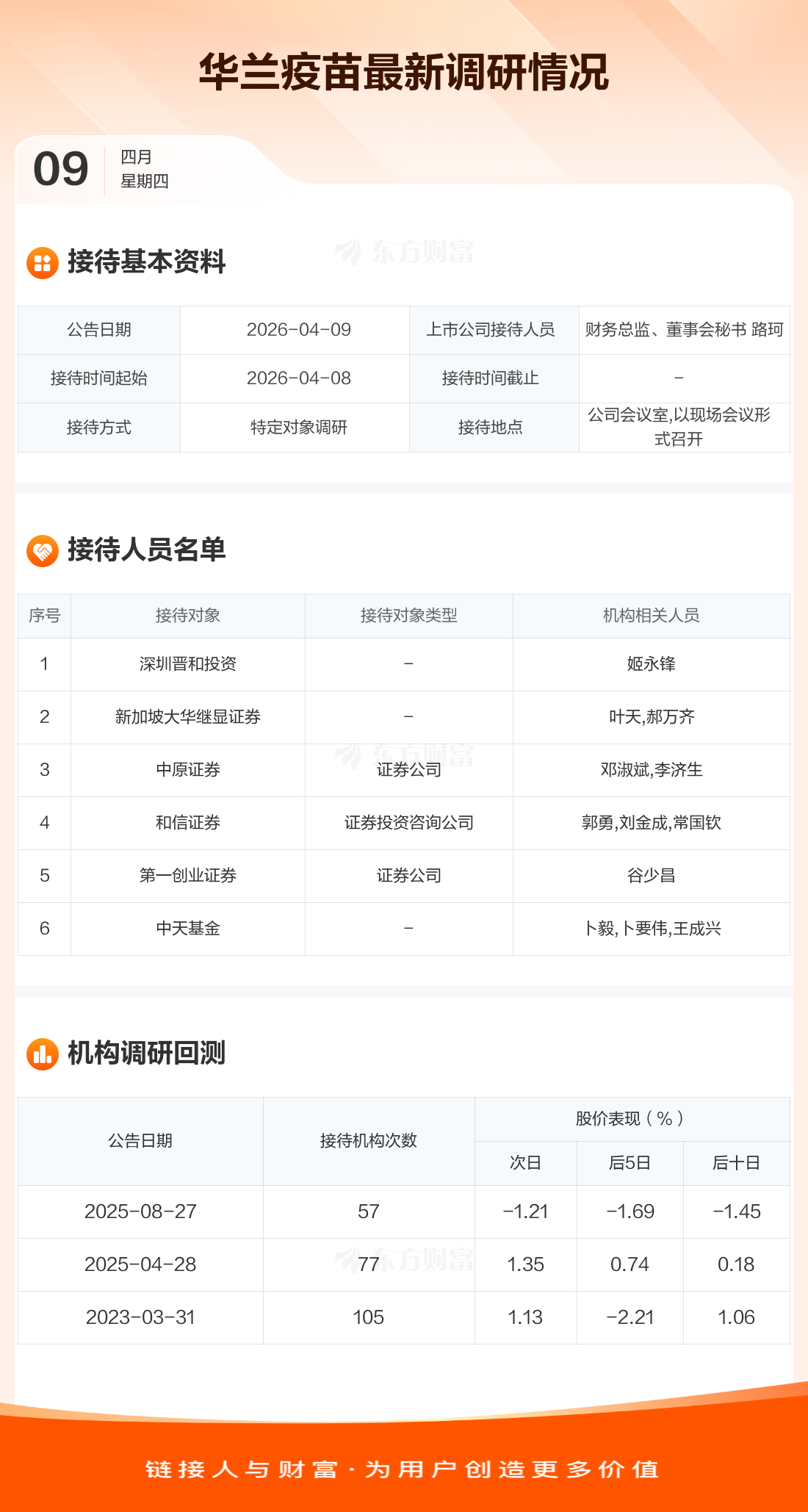 华兰疫苗4月9日公告称,4月8日接待深圳晋和投资等6家机构调研。接待人员包括财务总监、董事会秘书 路珂。