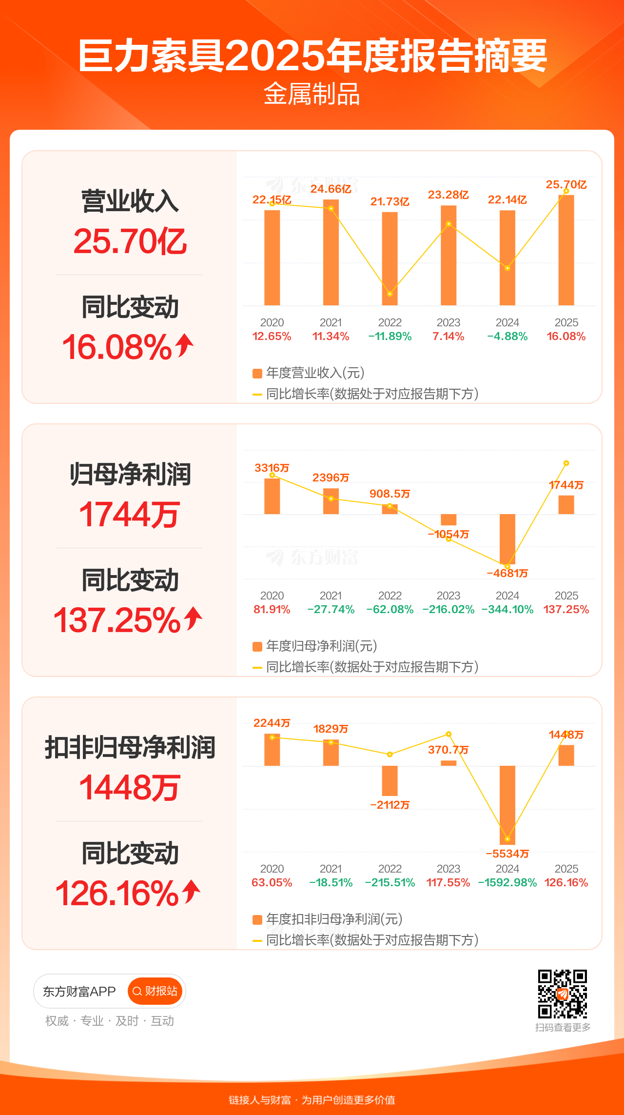巨力索具4月10日发布2025年年报显示,公司全年实现营业收入25.70亿元,同比增长16.08%;归母净利润1743.64万元,同比增长137.25%;扣非归母净利润1447.71万元,同比增长126.16%。