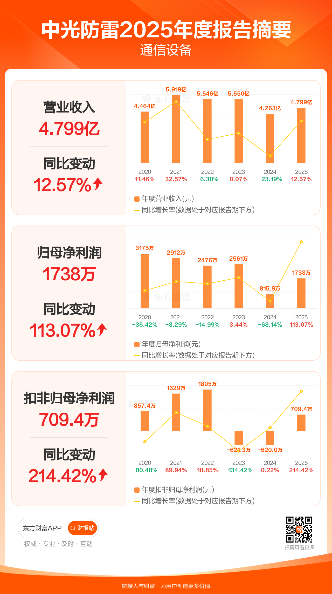 中光防雷4月10日发布2025年年报显示,公司全年实现营业收入4.80亿元,同比增长12.57%;归母净利润1738.43万元,同比增长113.07%;扣非归母净利润709.39万元,同比增长214.42%。