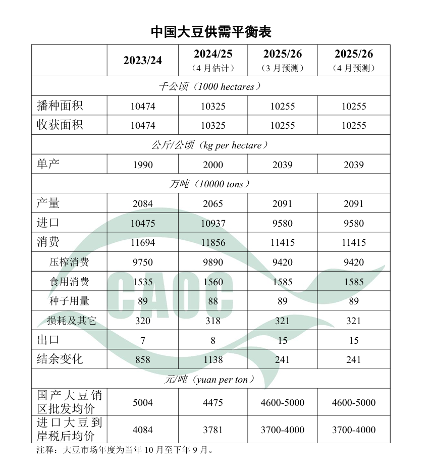 农业农村部发布4月供需报告,本月对中国大豆供需形势预测与上月保持一致。国内方面,东北地区春播临近,基层售粮意愿提升,叠加国产大豆持续拍卖,市场有效供给增加;近期随着蔬菜、猪肉供应增加、价格下跌,豆制品需求受到阶段性抑制,但总体仍保持稳定。国际方面,南美大豆进入收获后期与出口旺季,产量有望再创历史新高,全球大豆供应维持宽松格局,能源市场震荡成为影响短期国际大豆价格的关键变量,后期需重点关注原油价格走势及主产国生物燃料政策变化影响。