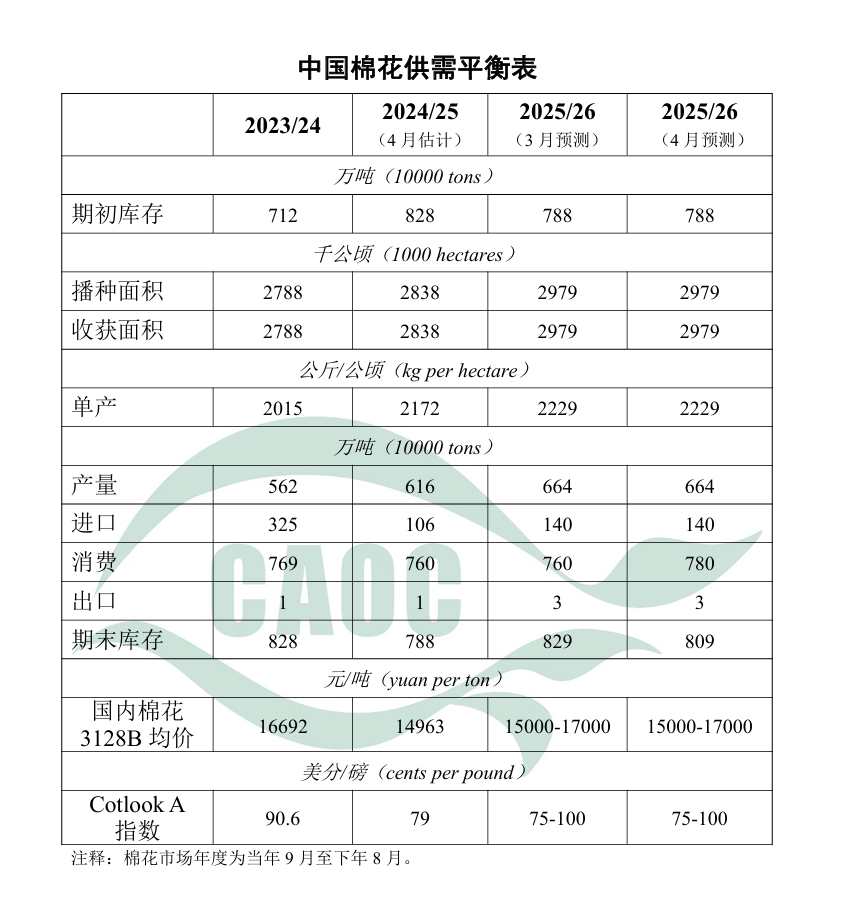 农业农村部发布4月供需报告,本月将2025/26年度中国棉花消费量较上月上调20万吨至780万吨,其它预测与上月保持一致。3月下旬以来,新疆棉区气温持续偏高,热量条件明显好于常年。据中国棉花信息网数据,截至4月6日,新疆棉花播种进度约25.4%,同比快11.3个百分点。纺织行业处于传统“金三银四”旺季,叠加中东冲突推升国际油价、拉高化纤原料成本,棉花比价优势凸显、替代需求提升,棉纺企业采购意愿增强。据中国棉花网数据,截至4月2日,全国棉花销售率81.3%,同比增16.7个百分点,较过去四年均值增20.3个百分点。为保障纺织企业加工贸易用棉需要,3月16日,国家发展改革委增发30万吨棉花进口滑准税加工贸易配额(较2025年增加10万吨,发放时间提前5个月)。受棉花需求回升及国际市场传导影响,预计后期国内棉价将维持高位震荡趋势。