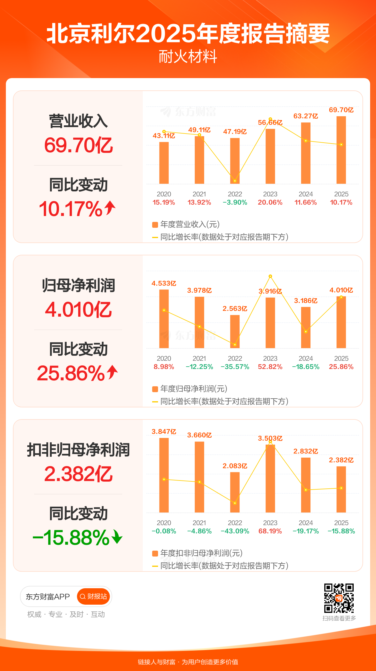 北京利尔4月10日发布2025年年报显示,公司全年实现营业收入69.70亿元,同比增长10.17%;归母净利润4.01亿元,同比增长25.86%;扣非归母净利润2.38亿元,同比下滑15.88%。