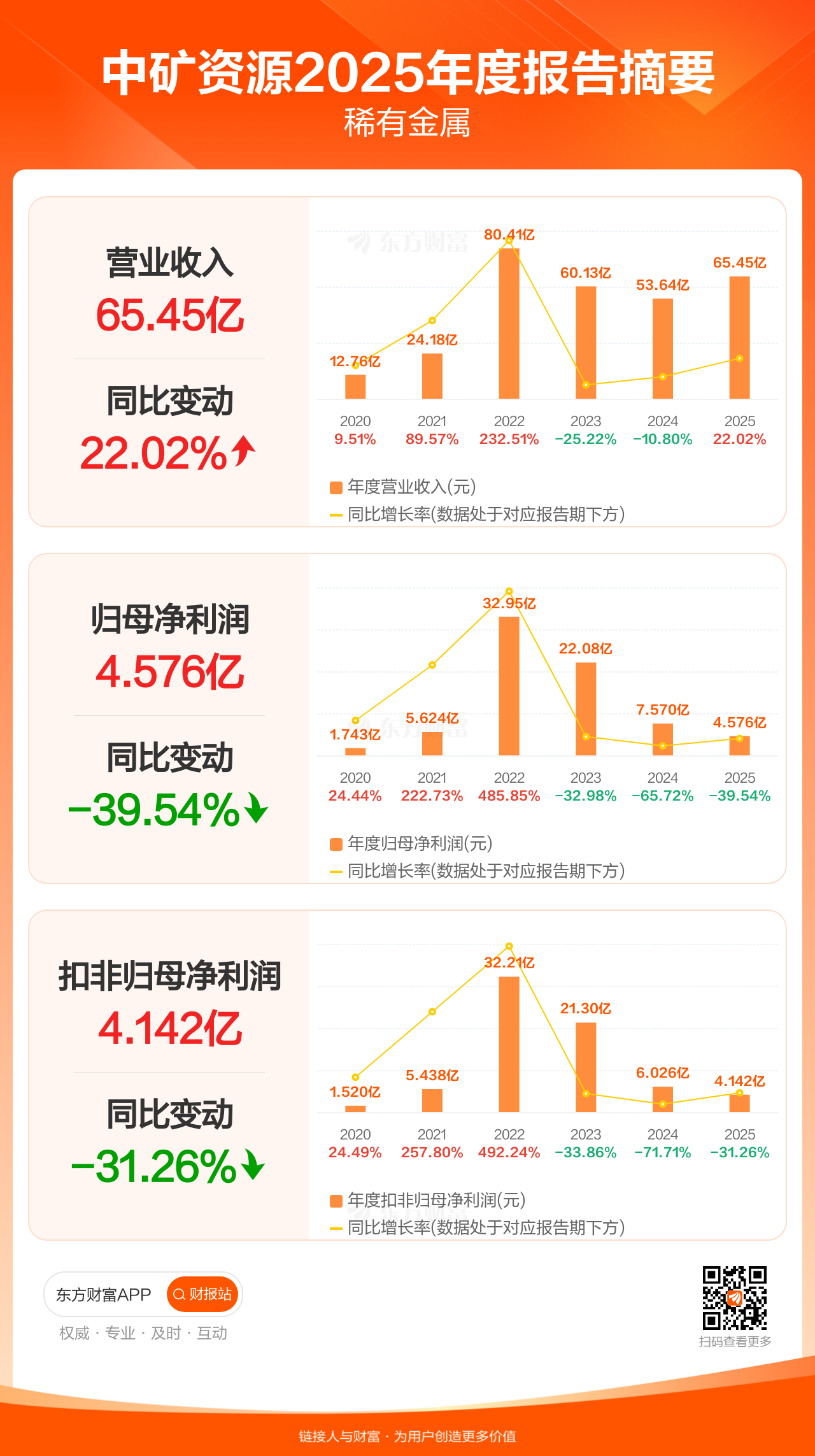 中矿资源4月10日发布2025年年报显示,公司全年实现营业收入65.45亿元,同比增长22.02%;归母净利润4.58亿元,同比下滑39.54%;扣非归母净利润4.14亿元,同比下滑31.26%。
