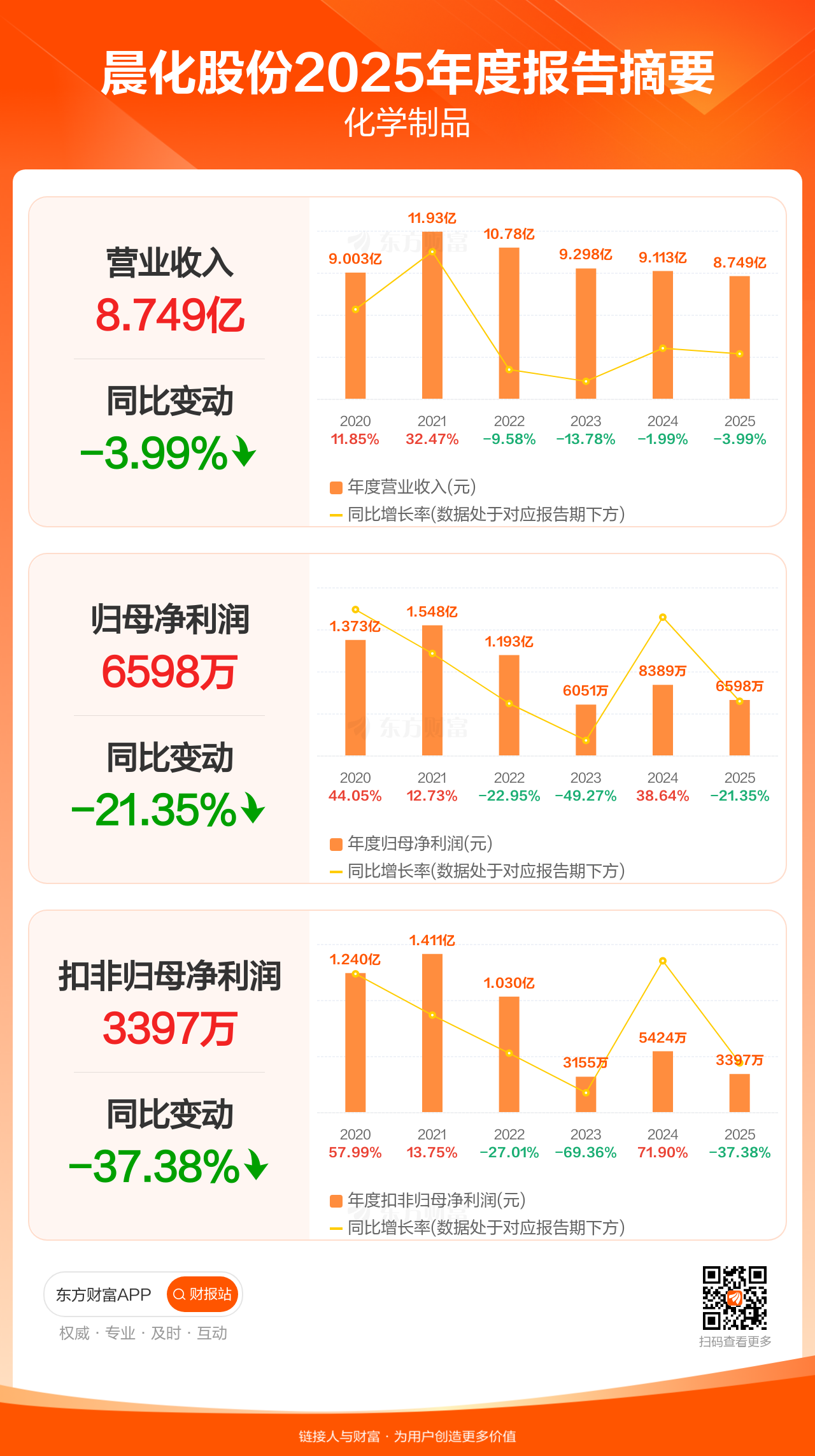 晨化股份4月10日发布2025年年报显示,公司全年实现营业收入8.75亿元,同比下滑3.99%;归母净利润6598.33万元,同比下滑21.35%;扣非归母净利润3396.65万元,同比下滑37.38%。