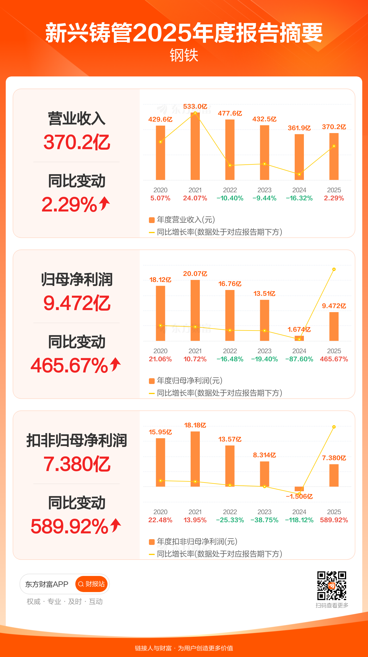 新兴铸管4月10日发布2025年年报显示,公司全年实现营业收入370.22亿元,同比增长2.29%;归母净利润9.47亿元,同比增长465.67%;扣非归母净利润7.38亿元,同比增长589.92%。