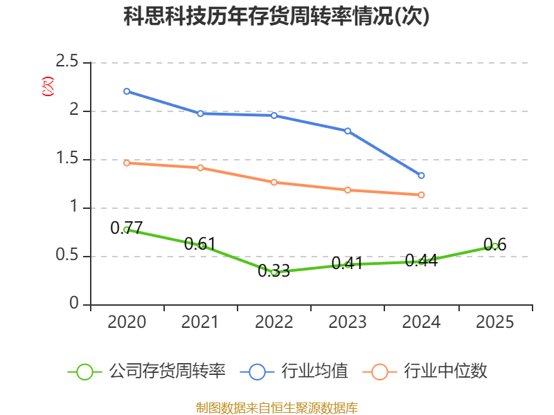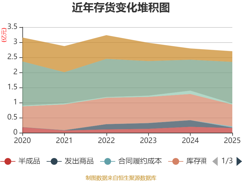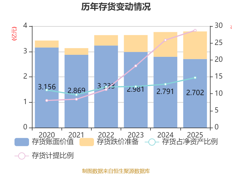 从存货变动来看,截至2025年末,公司存货账面价值为2.7亿元,占净资产的14.76%,较上年末减少892.96万元。其中,存货跌价准备为1.09亿元,计提比例为28.72%。