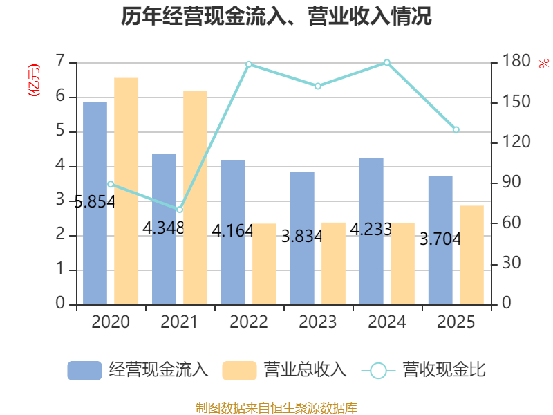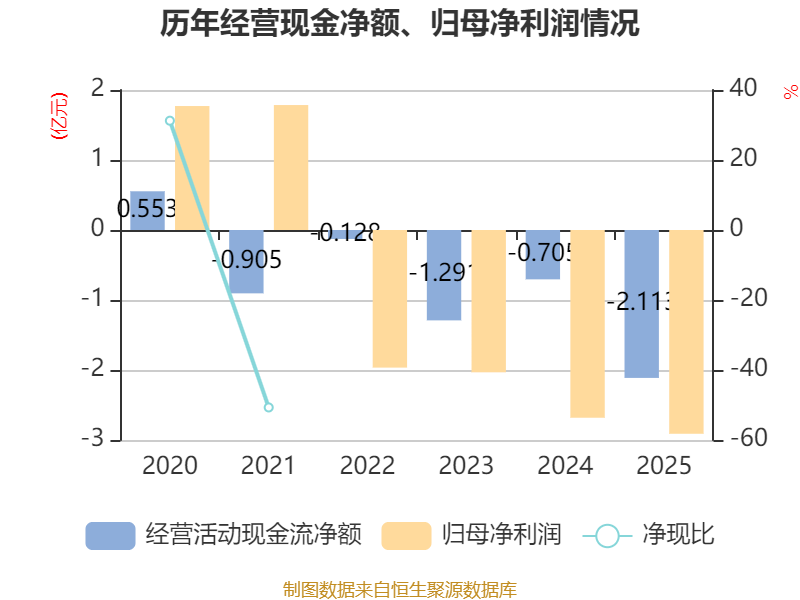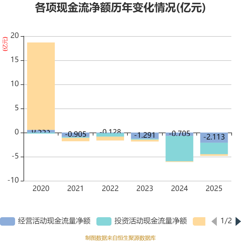 截至2025年,公司经营活动现金流净额为-2.11亿元,同比减少1.41亿元;筹资活动现金流净额-3428.43万元,同比减少1994.71万元;投资活动现金流净额-2.38亿元,上年同期为-5.26亿元。