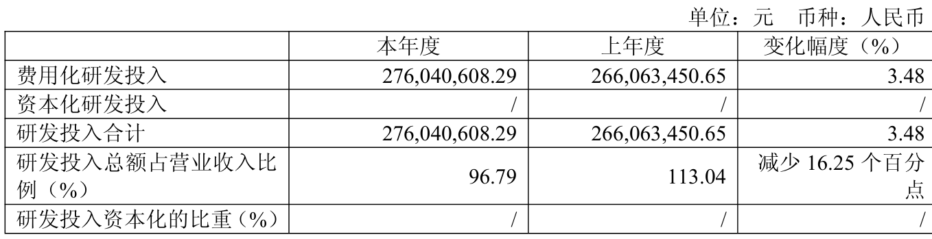 2025年全年,公司研发投入金额为2.76亿元,同比增长3.75%;研发投入占营业收入比例为96.79%,相比上年同期下降16.25个百分点。