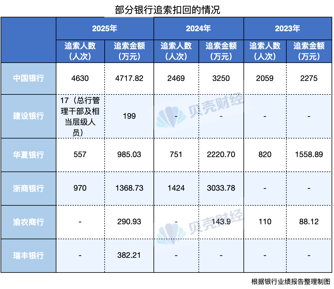 中国银行被追索的人数及金额最多。根据中国银行年报,2025年该行共计对4630人次执行追索扣回,金额合计4717.82万元。该行近年来追索扣回的力度持续增加,2024年该行共计对2469人次执行追索扣回,金额合计3250万元;而2023年则对2059人次追索扣回,金额合计2275万元。按此计算,三年间该行共对9158人次追索扣回,总金额超过亿元。