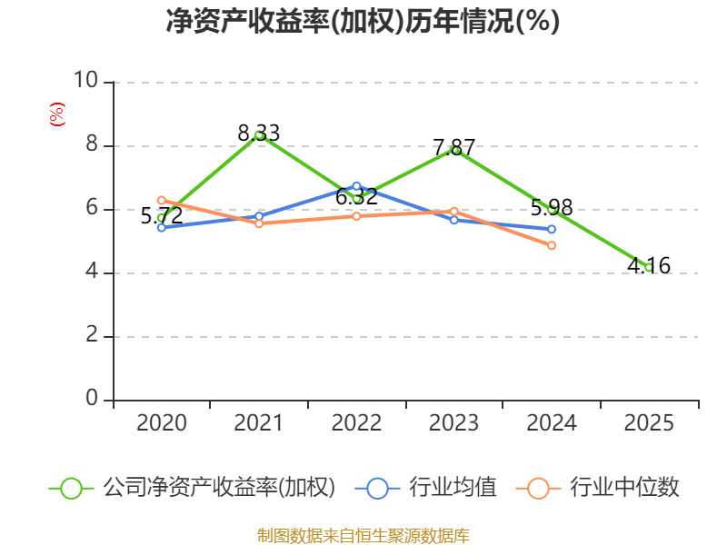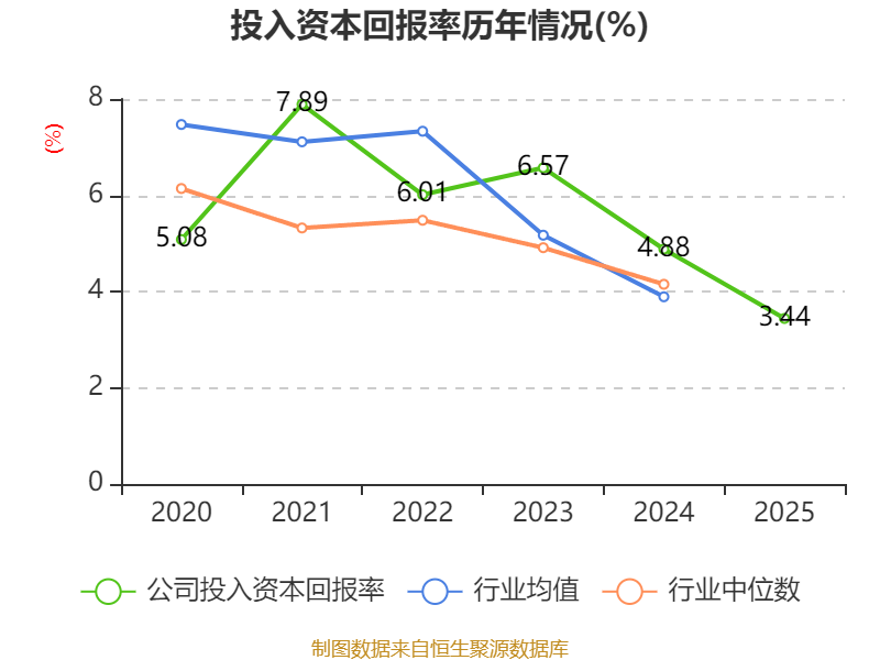 数据显示,2025年公司加权平均净资产收益率为4.16%,较上年同期下降1.82个百分点。公司2025年投入资本回报率为3.44%,较上年同期下降1.44个百分点。