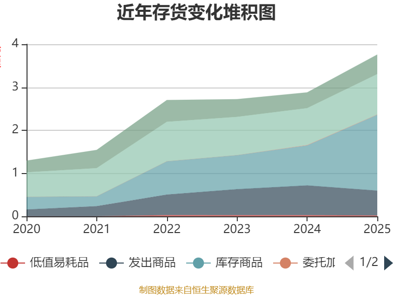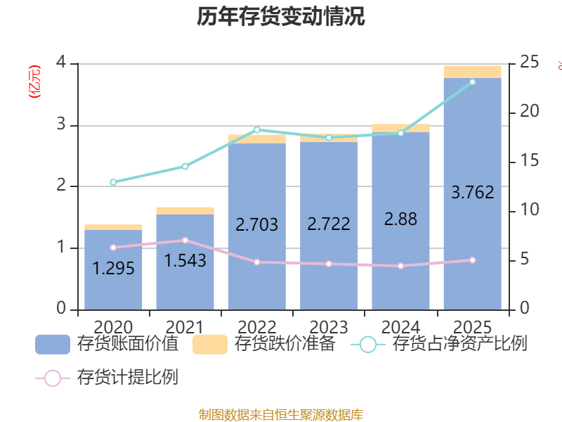 从存货变动来看,截至2025年末,公司存货账面价值为3.76亿元,占净资产的23.11%,较上年末增加8816.04万元。其中,存货跌价准备为1984.8万元,计提比例为5.01%。