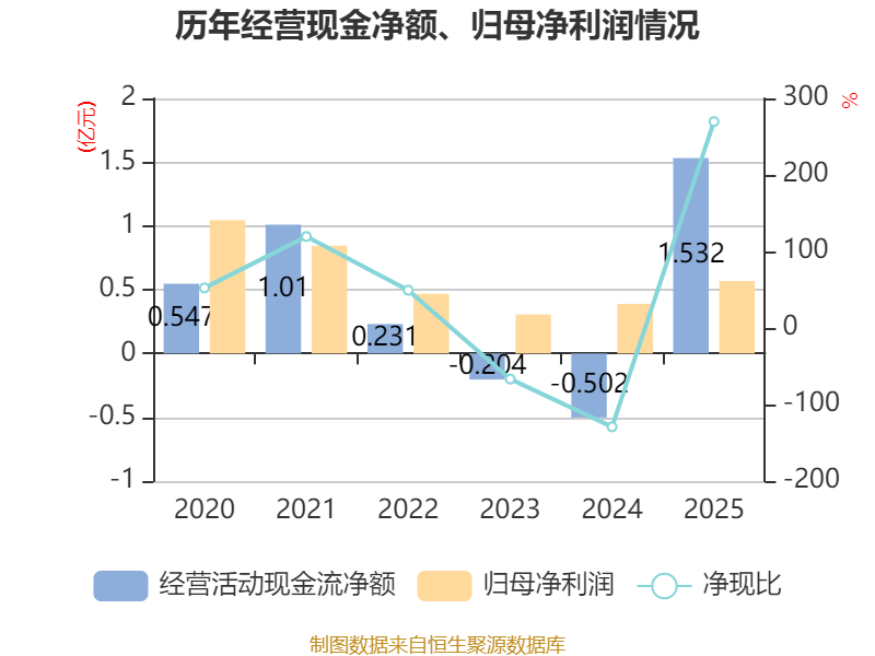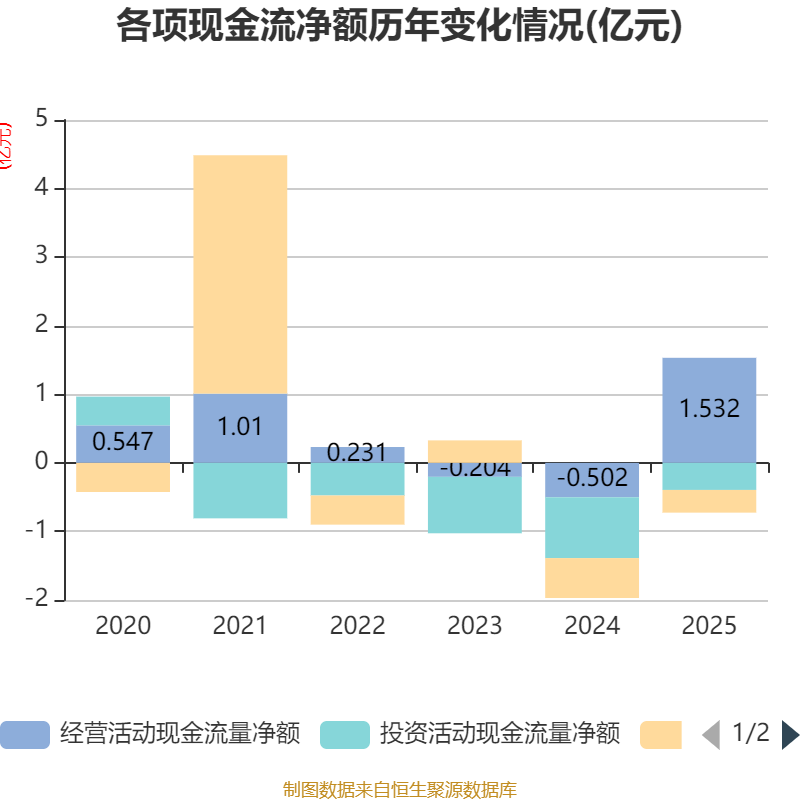 截至2025年,公司经营活动现金流净额为1.53亿元,同比增加2.03亿元;筹资活动现金流净额-3305.69万元,同比增加2511.64万元;投资活动现金流净额-3950.58万元,上年同期为-8870.1万元。