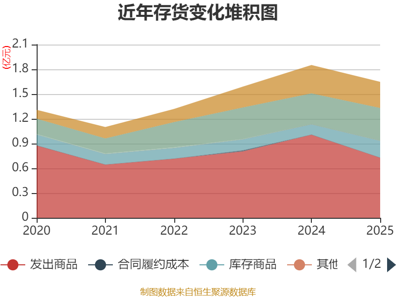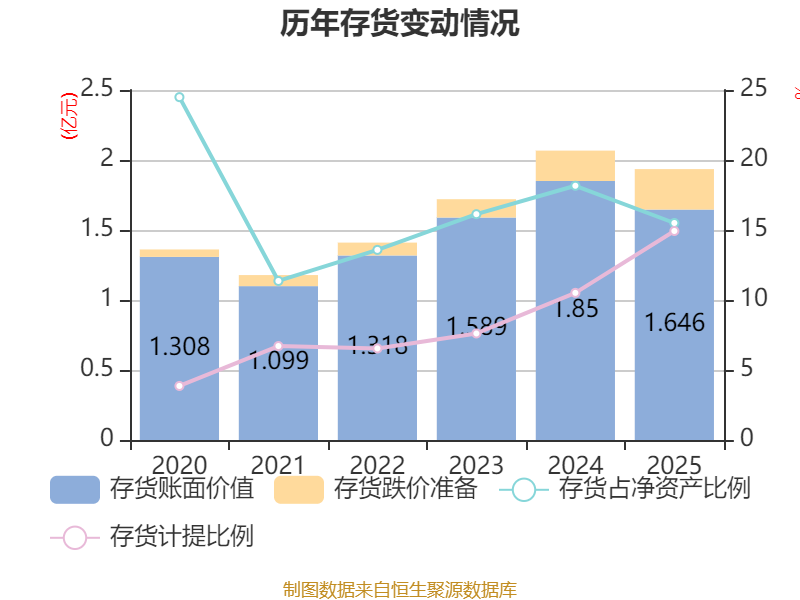 从存货变动来看,截至2025年末,公司存货账面价值为1.65亿元,占净资产的15.5%,较上年末减少2039.84万元。其中,存货跌价准备为2888.97万元,计提比例为14.93%。