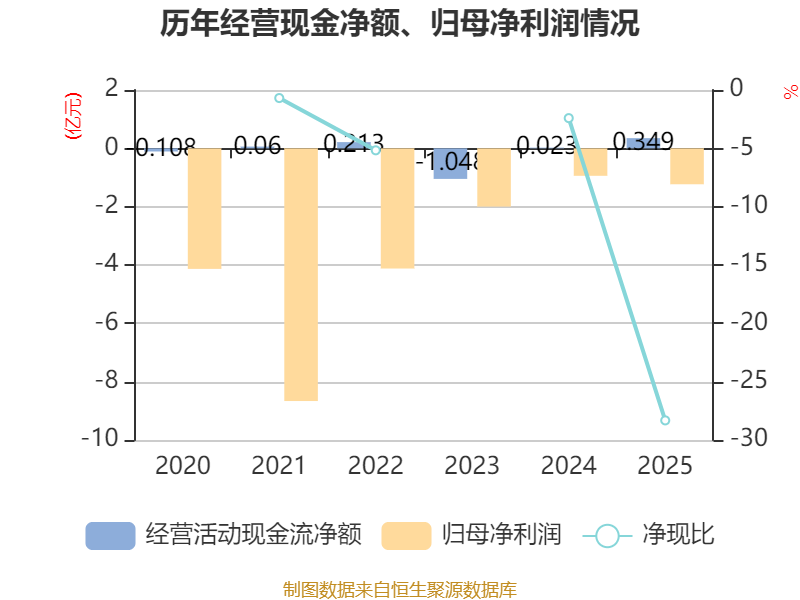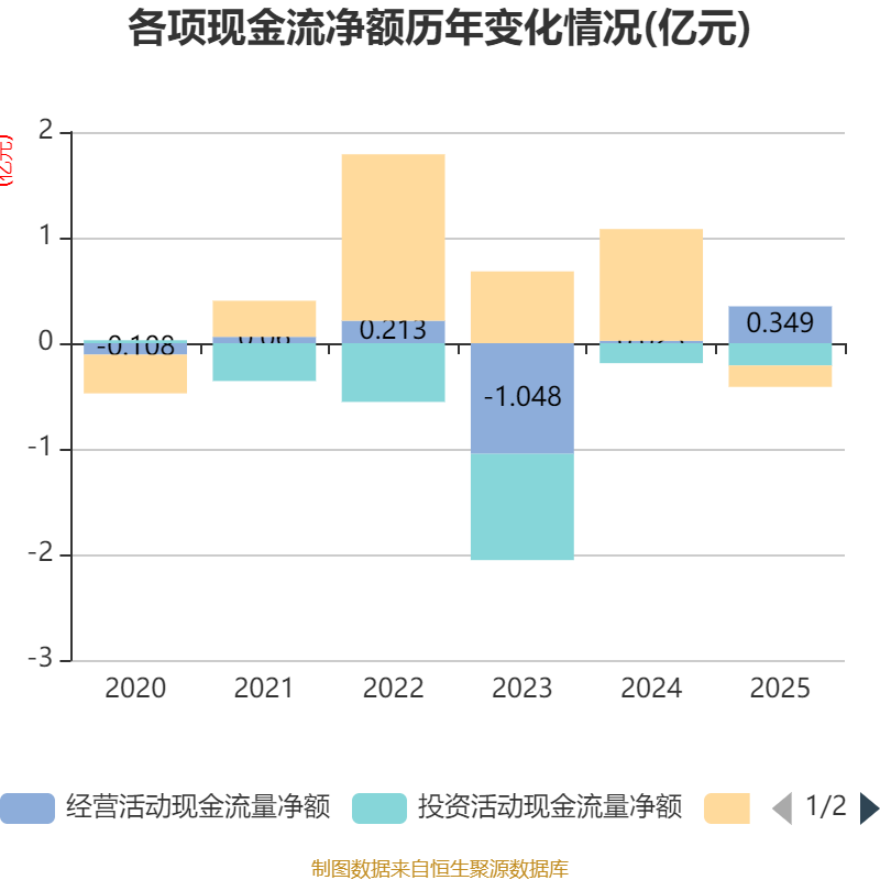 截至2025年,公司经营活动现金流净额为3489.92万元,同比增长1438.67%;筹资活动现金流净额-2025.51万元,同比减少1.26亿元;投资活动现金流净额-2107.53万元,上年同期为-1886.98万元。