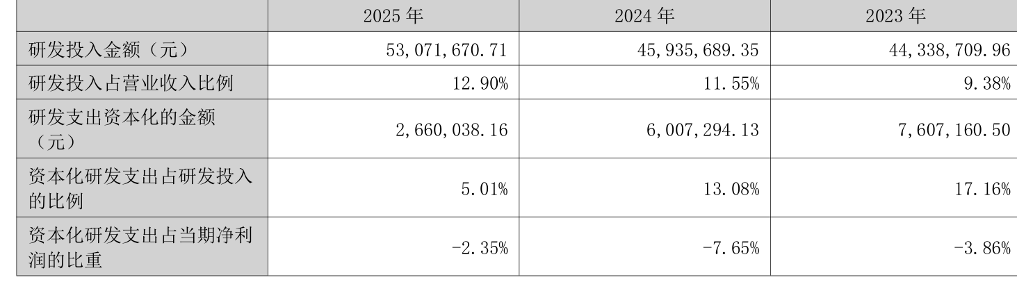 2025年全年,公司研发投入金额为5307.17万元,同比增长15.53%;研发投入占营业收入比例为12.9%,相比上年同期上升1.35个百分点。此外,公司全年研发投入资本化率为5.01%。