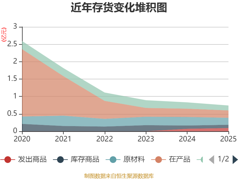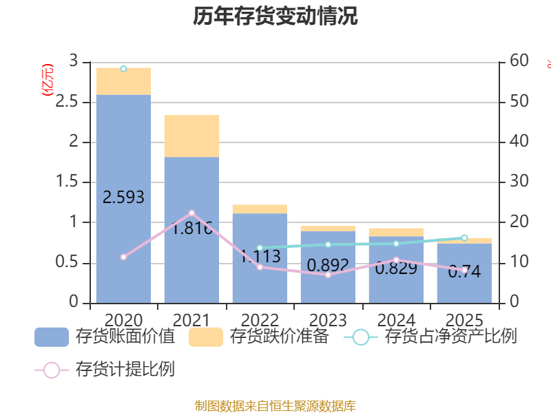 从存货变动来看,截至2025年末,公司存货账面价值为7399.98万元,占净资产的16.18%,较上年末减少889.04万元。其中,存货跌价准备为657.65万元,计提比例为8.16%。