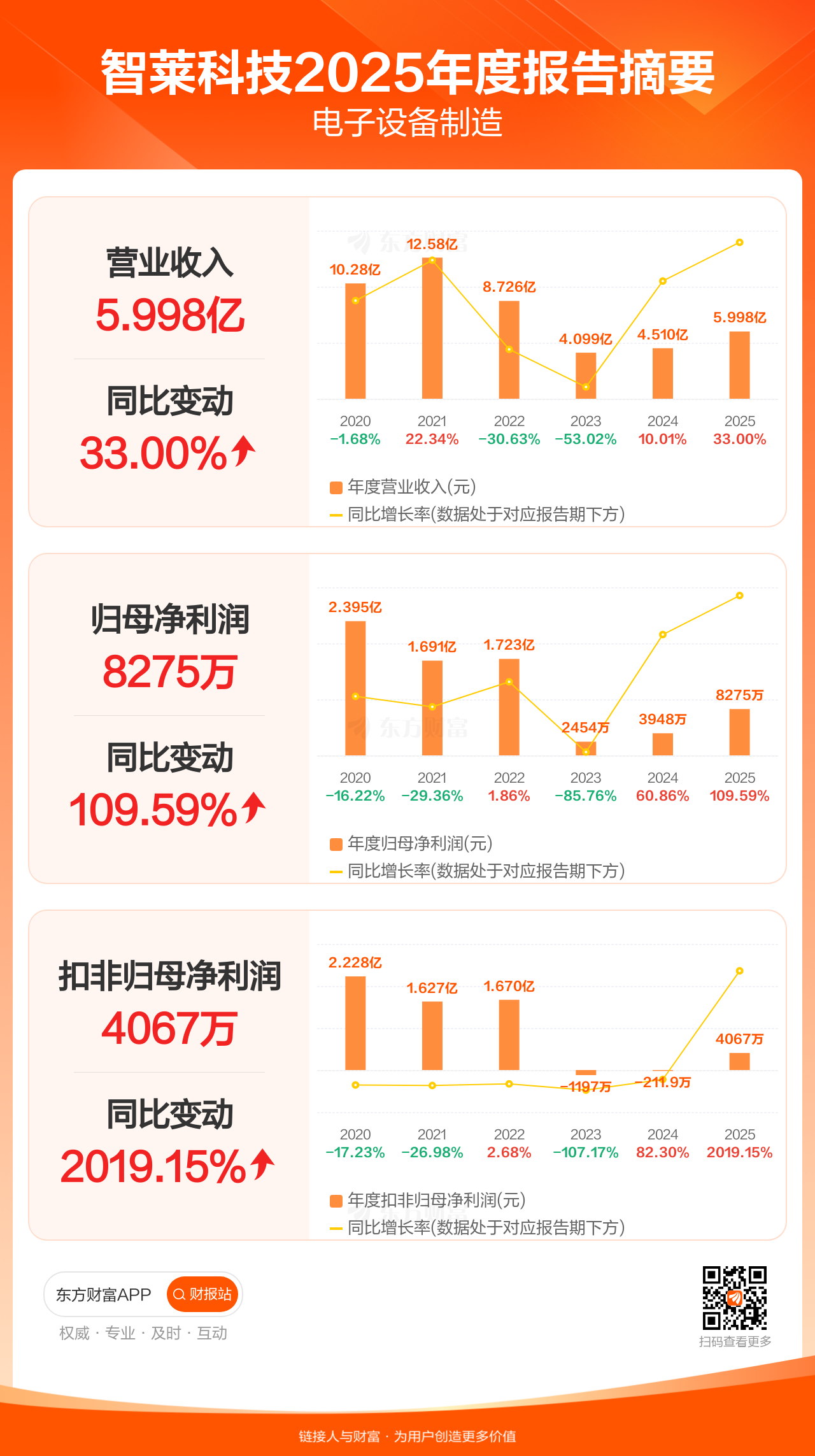 智莱科技4月10日发布2025年年报显示,公司全年实现营业收入6.00亿元,同比增长33.00%;归母净利润8274.51万元,同比增长109.59%;扣非归母净利润4066.94万元,同比增长2019.15%。