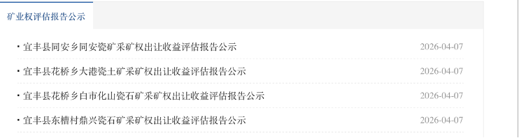 4月9日,中国证券报·中证金牛座记者从江西省自然资源厅官网获悉,日前,宜春四家锂矿公示了采矿权出让收益评估报告,分别为宜丰县同安乡同安瓷矿、宜丰县花桥乡大港瓷土矿、宜丰县花桥乡白市化山瓷石矿、宜丰县东槽村鼎兴瓷石矿。
