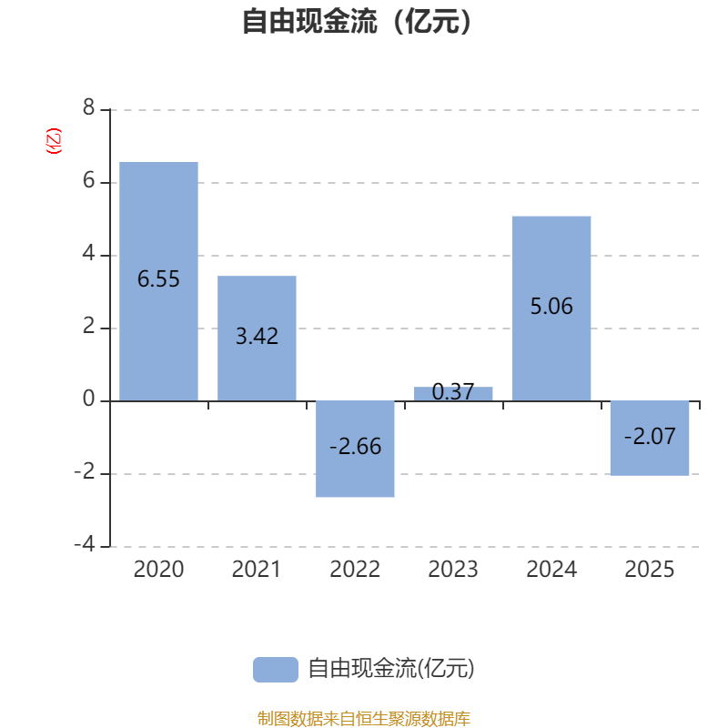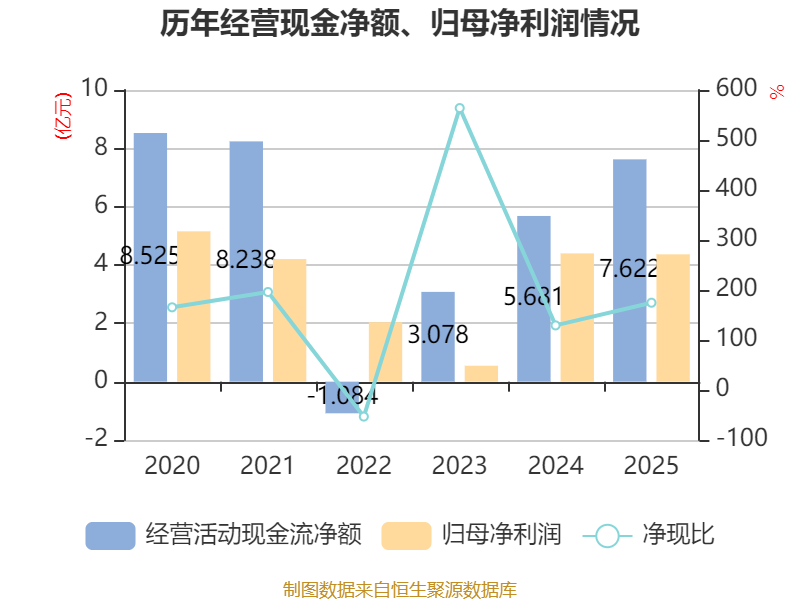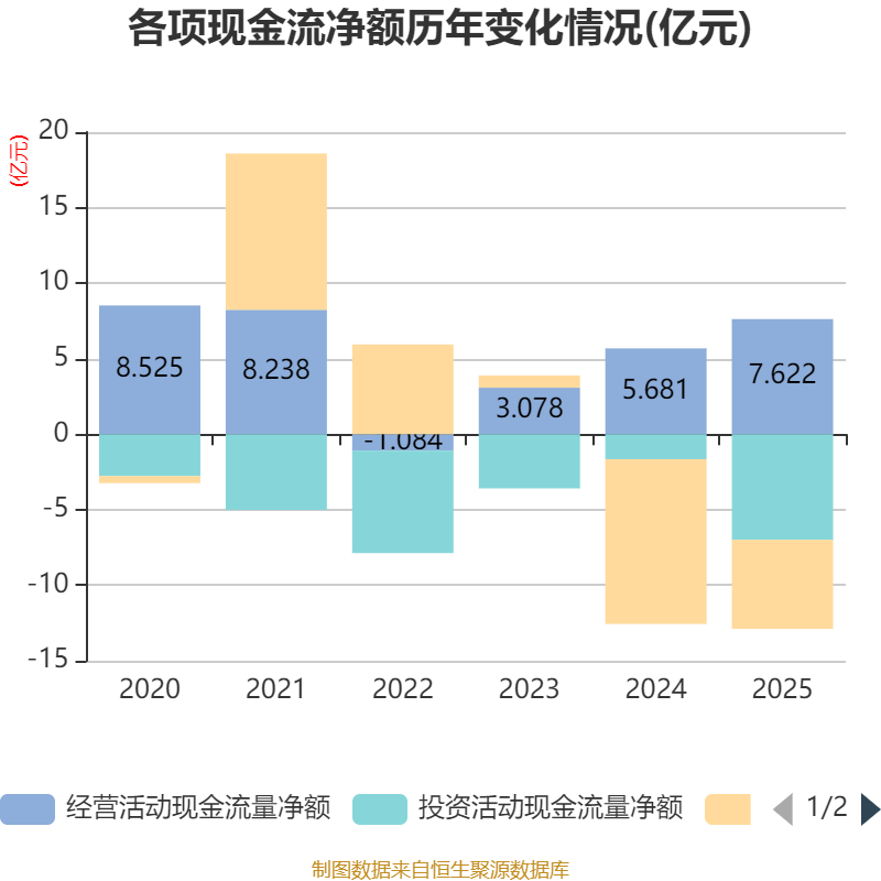 截至2025年,公司经营活动现金流净额为7.62亿元,同比增长34.15%;筹资活动现金流净额-5.9亿元,同比增加5.01亿元;投资活动现金流净额-6.99亿元,上年同期为-1.66亿元。