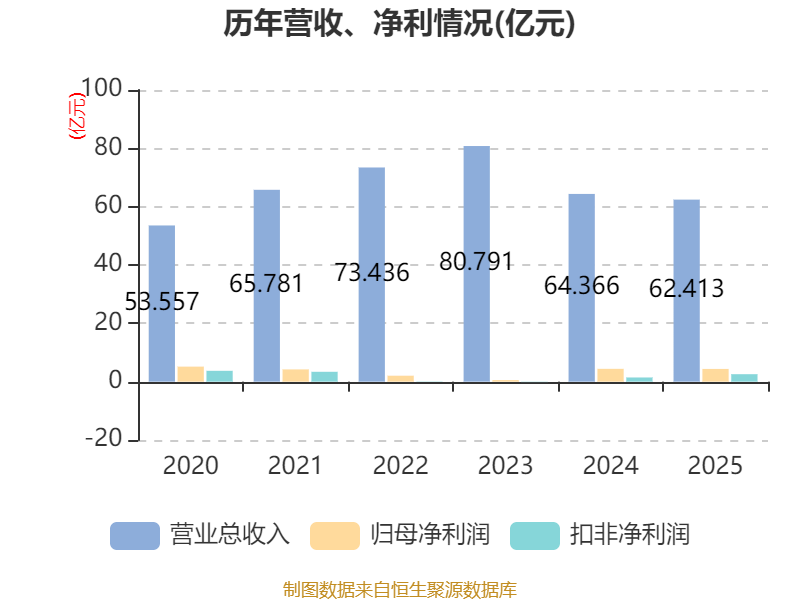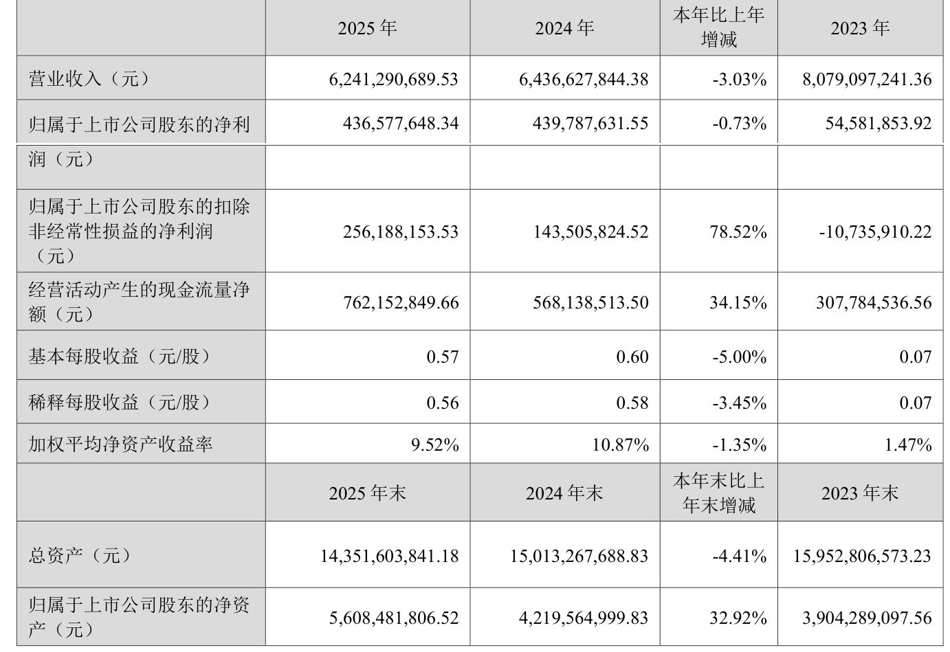 中证智能财讯西子洁能(002534)4月10日披露2025年年度报告。2025年,公司实现营业总收入62.41亿元,同比下降3.03%;归母净利润4.37亿元,同比下降0.73%;扣非净利润2.56亿元,同比增长78.52%;经营活动产生的现金流量净额为7.62亿元,同比增长34.15%;报告期内,西子洁能基本每股收益为0.57元,加权平均净资产收益率为9.52%。公司2025年度分配预案为:拟向全体股东每10股派现1元(含税)。