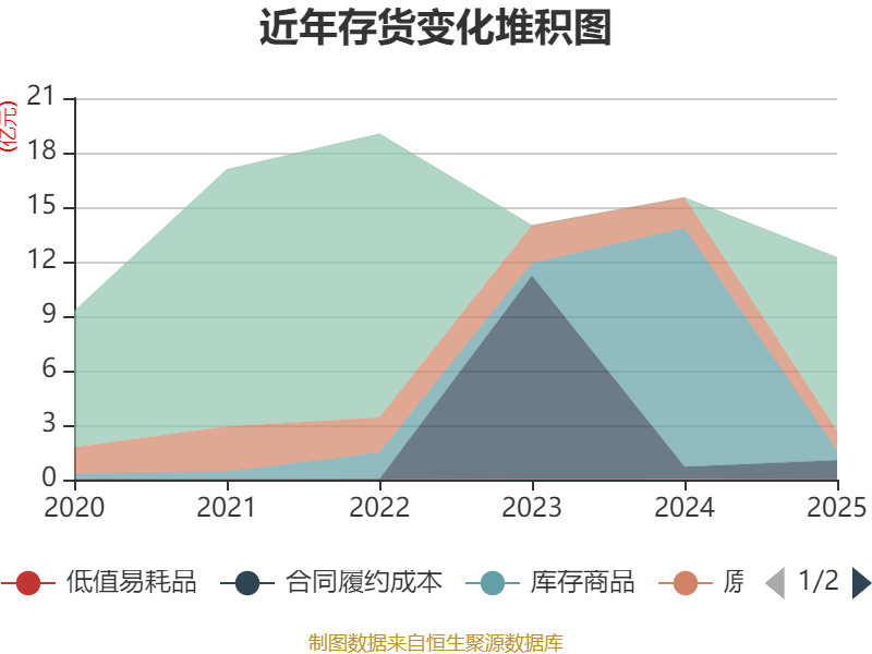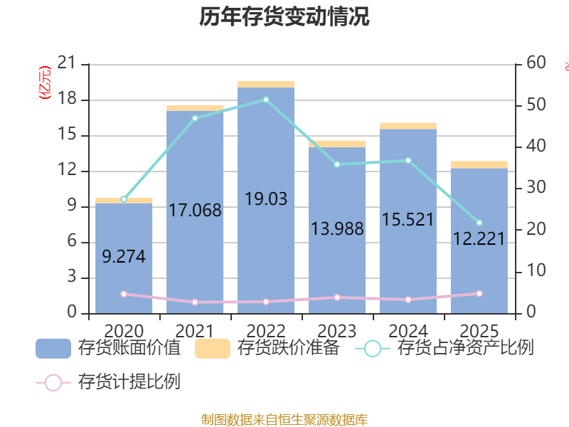 从存货变动来看,截至2025年末,公司存货账面价值为12.22亿元,占净资产的21.79%,较上年末减少3.3亿元。其中,存货跌价准备为6050.26万元,计提比例为4.72%。