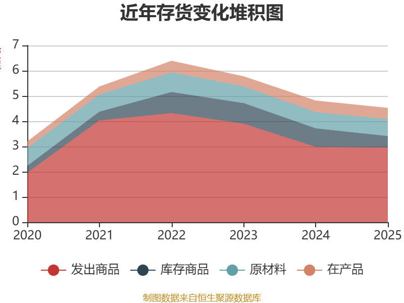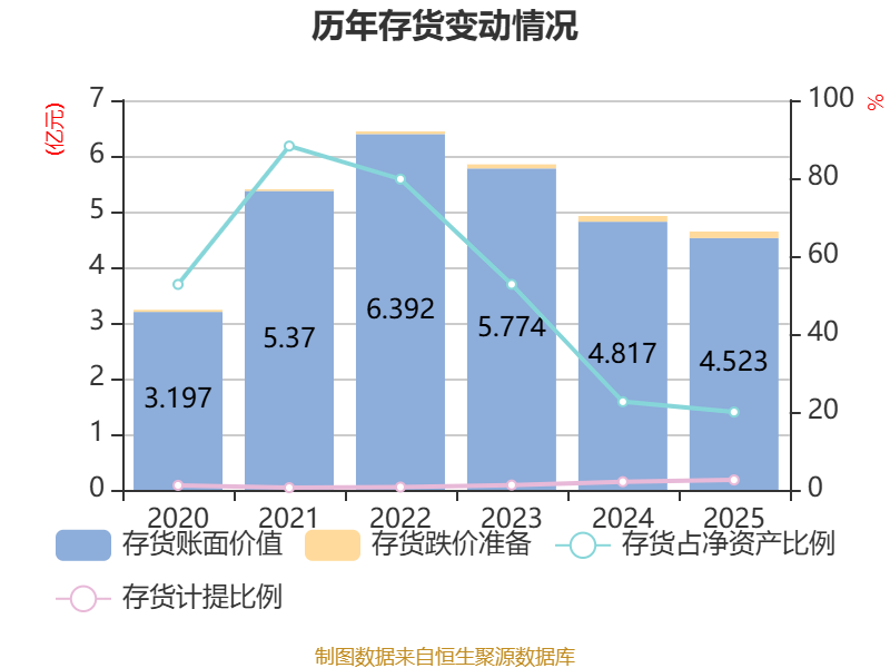 从存货变动来看,截至2025年末,公司存货账面价值为4.52亿元,占净资产的19.97%,较上年末减少2936.98万元。其中,存货跌价准备为1179.88万元,计提比例为2.54%。