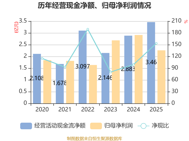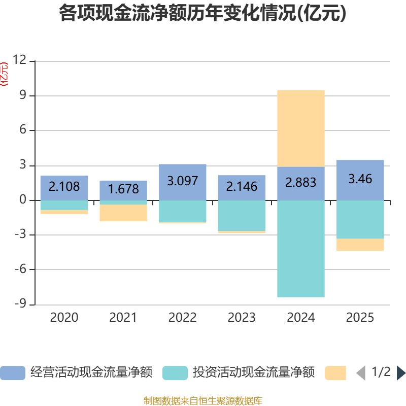 截至2025年,公司经营活动现金流净额为3.46亿元,同比增长20.02%;筹资活动现金流净额-1.04亿元,同比减少7.64亿元;投资活动现金流净额-3.33亿元,上年同期为-8.37亿元。