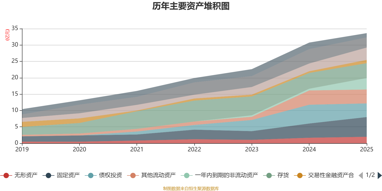 资产重大变化方面,截至2025年末,公司一年内到期的非流动资产较上年末增加560.19%,占公司总资产比重上升8.72个百分点;债权投资较上年末减少27.27%,占公司总资产比重下降6.26个百分点;货币资金较上年末减少29.45%,占公司总资产比重下降5.1个百分点;固定资产较上年末增加38.89%,占公司总资产比重上升3.81个百分点。