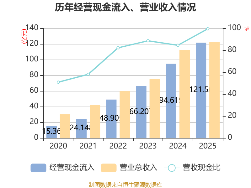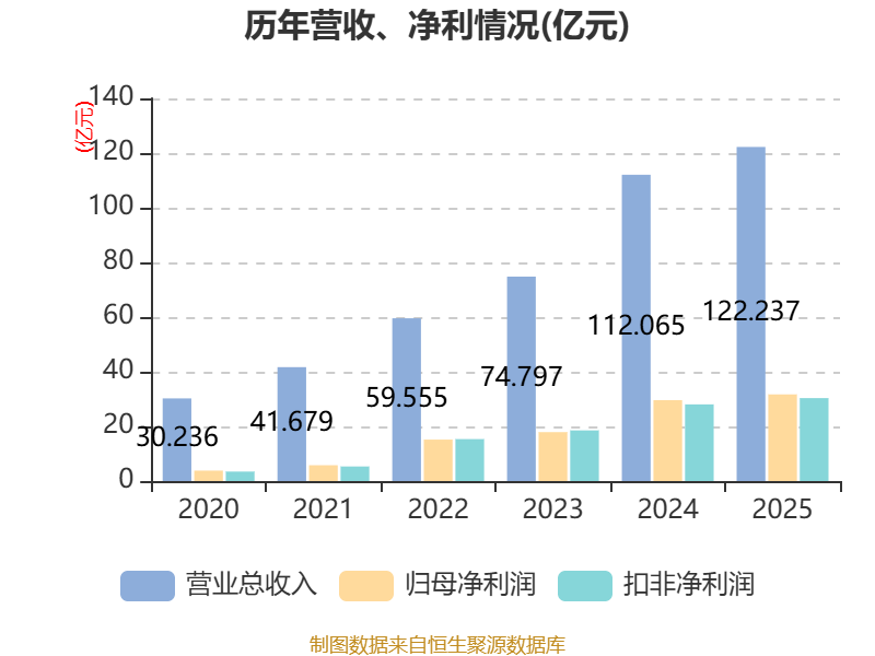 中证智能财讯德业股份(605117)4月10日披露2025年年度报告。2025年,公司实现营业总收入122.24亿元,同比增长9.08%;归母净利润31.71亿元,同比增长7.11%;扣非净利润30.35亿元,同比增长8.20%;经营活动产生的现金流量净额为39.86亿元,同比增长18.40%;报告期内,德业股份基本每股收益为3.51元,加权平均净资产收益率为32.66%。公司2025年度分配预案为:拟向全体股东每10股转4股,派现18元(含税)。