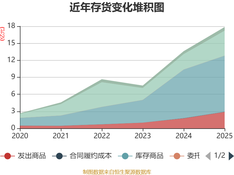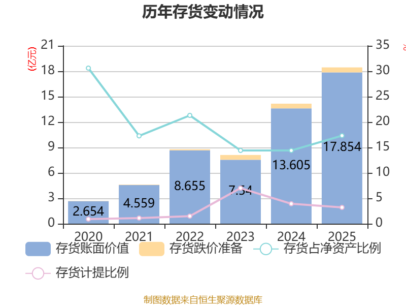从存货变动来看,截至2025年末,公司存货账面价值为17.85亿元,占净资产的17.32%,较上年末增加4.25亿元。其中,存货跌价准备为5898.01万元,计提比例为3.2%。