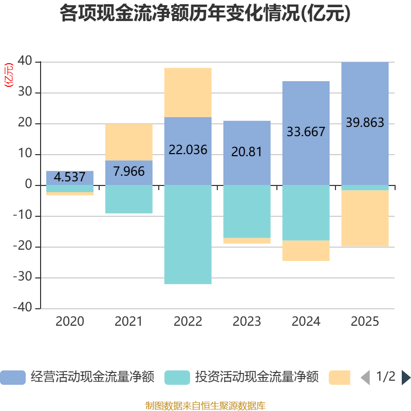 截至2025年,公司经营活动现金流净额为39.86亿元,同比增长18.4%;筹资活动现金流净额-18.12亿元,同比减少11.52亿元;投资活动现金流净额-1.77亿元,上年同期为-18.05亿元。