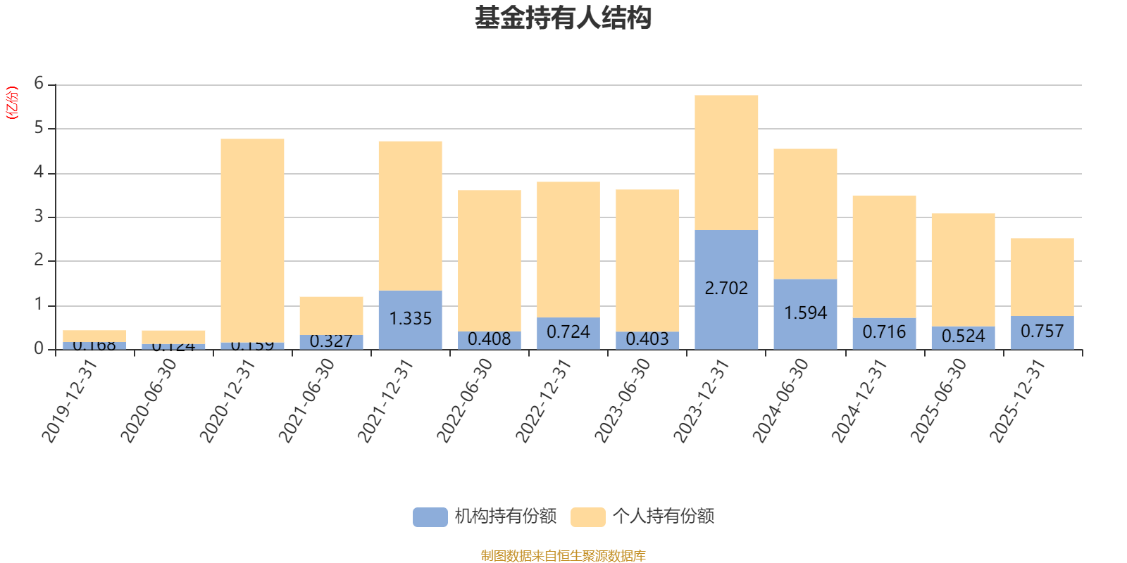 截至2025年12月31日,基金持有人共计6485户,合计持有2.52亿份。其中管理人员工持有89.14万份,占比0.35%,机构持有份额占比30.06%,个人投资者占比69.94%。