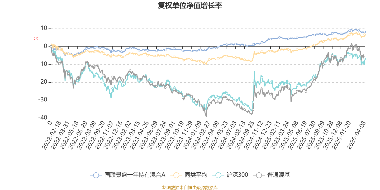 截至4月8日,国联景盛一年持有混合A近三个月复权单位净值增长率为0.06%,位于同类可比基金401/629;近半年复权单位净值增长率为1.77%,位于同类可比基金265/629;近一年复权单位净值增长率为3.59%,位于同类可比基金530/629;近三年复权单位净值增长率为10.15%,位于同类可比基金319/581。