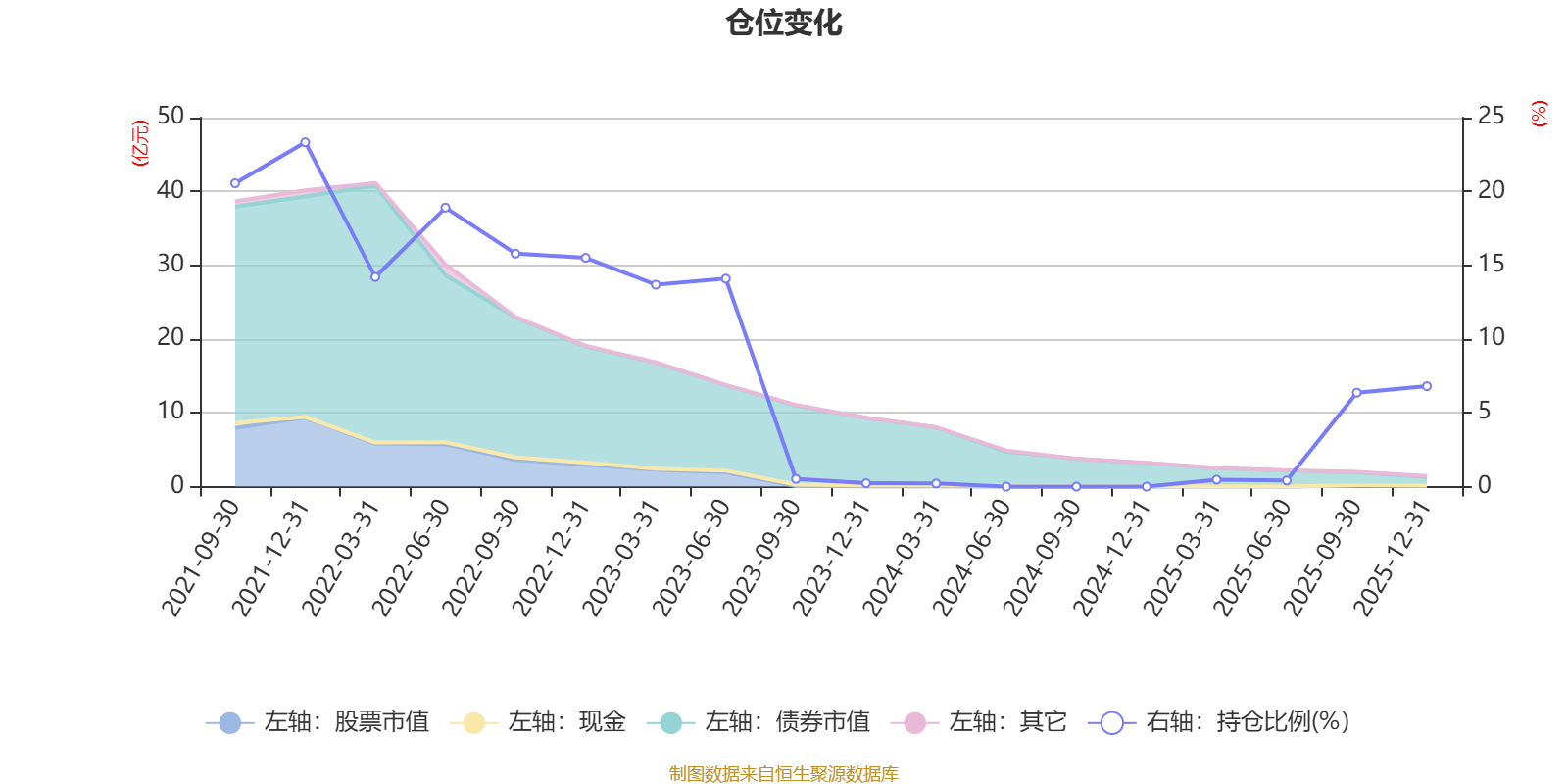 据定期报告数据统计,近三年平均股票仓位为3.56%,同类平均为19.2%。2021年末基金达到23.33%的最高仓位,2024年一季度末最低,为0.21%。