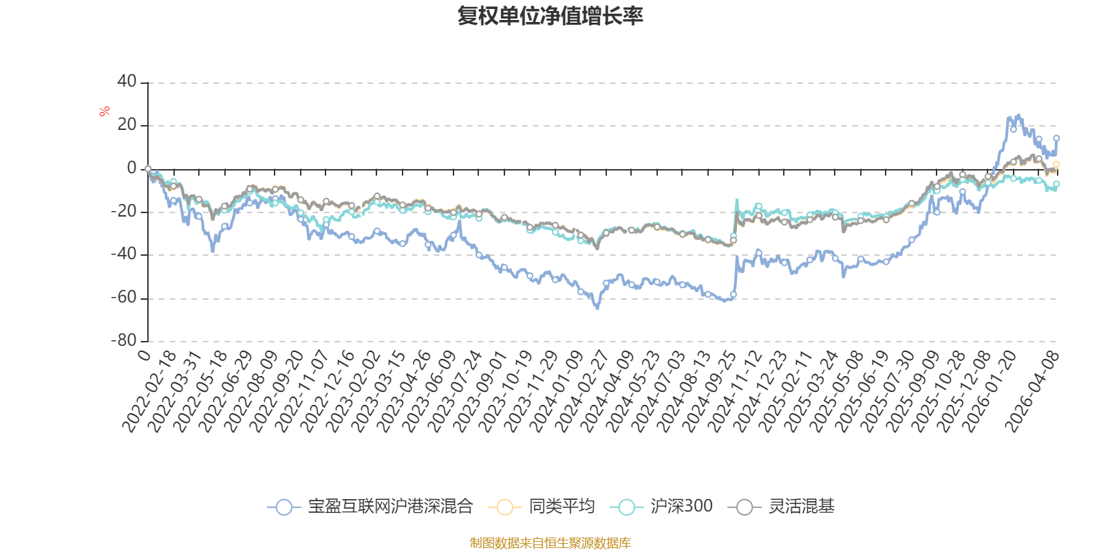 截至4月8日,宝盈互联网沪港深混合近三个月复权单位净值增长率为-0.49%,位于同类可比基金726/1287;近半年复权单位净值增长率为32.94%,位于同类可比基金28/1286;近一年复权单位净值增长率为126.69%,位于同类可比基金36/1286;近三年复权单位净值增长率为57.84%,位于同类可比基金106/1286。
