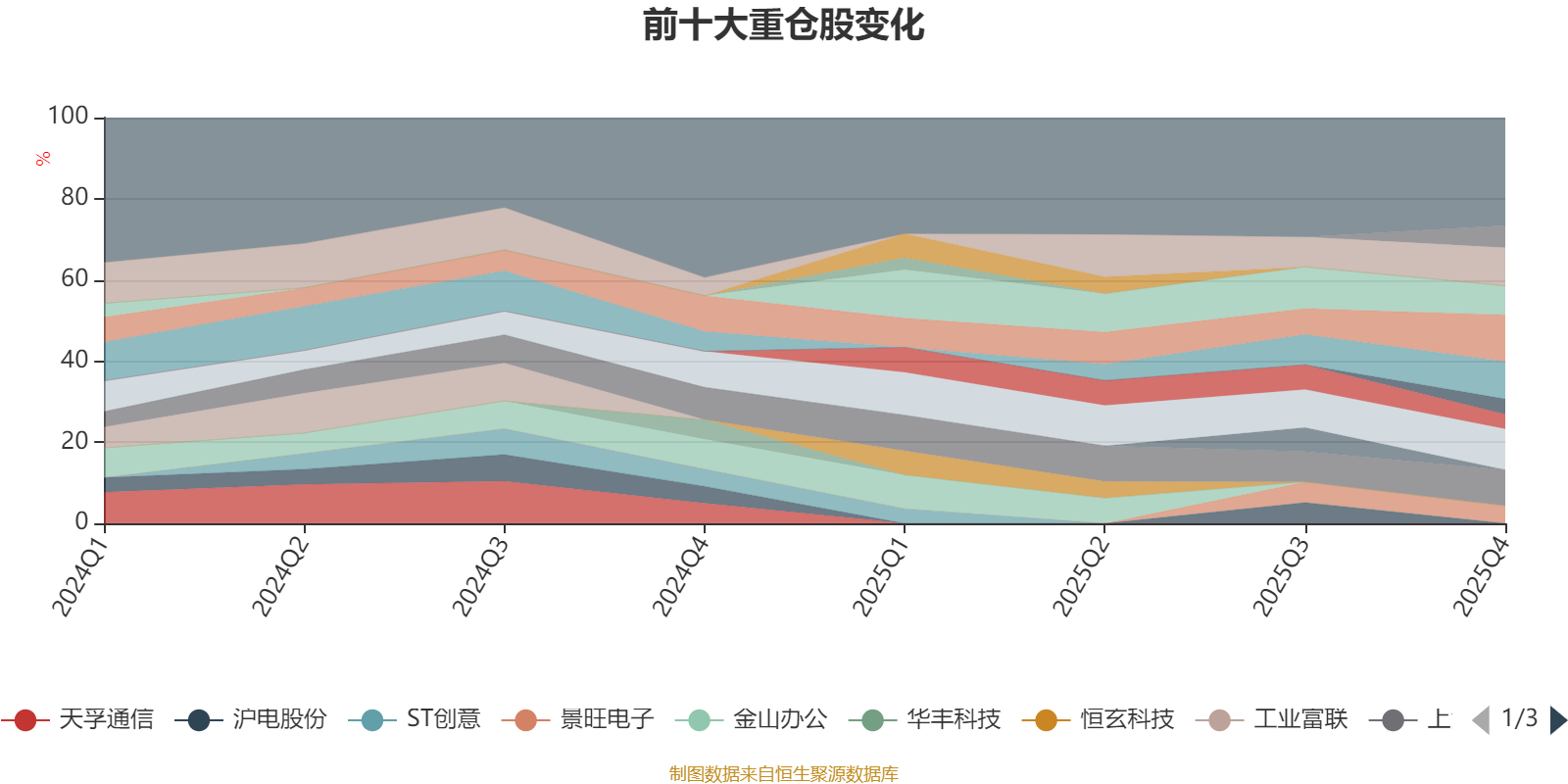 该基金持股集中度较高,近2年前十大重仓股集中度长期超过60%。截至2025年末,基金十大重仓股分别是*ST铖昌、臻镭科技、中际旭创、新易盛、上海瀚讯、腾讯控股、生益科技、景旺电子、上海港湾、小米集团-W。